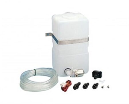 Set içeriğinde 2.5 litre su deposu, montaj braketi, 12V pompa, şeffaf hortum, iki adet püskürtme başlığı ve T konnektör mevcuttur.
